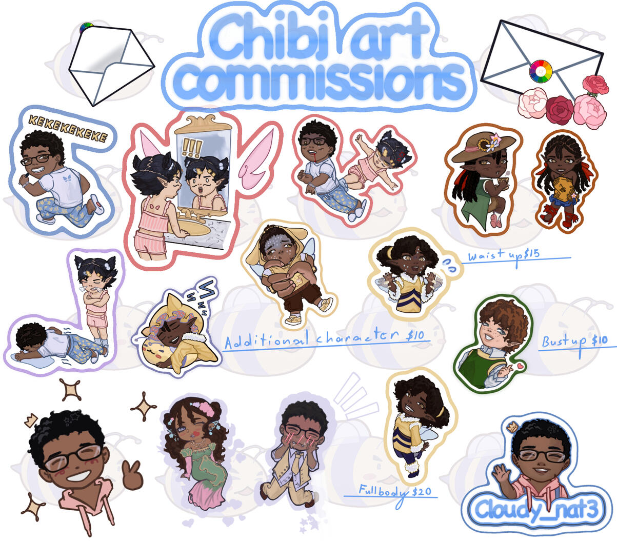 here are some examples of my chibi art. I recently started drawing chibi art this past year and have made lots of improvements. i try to base them off of this like nendroids and the emotes style.